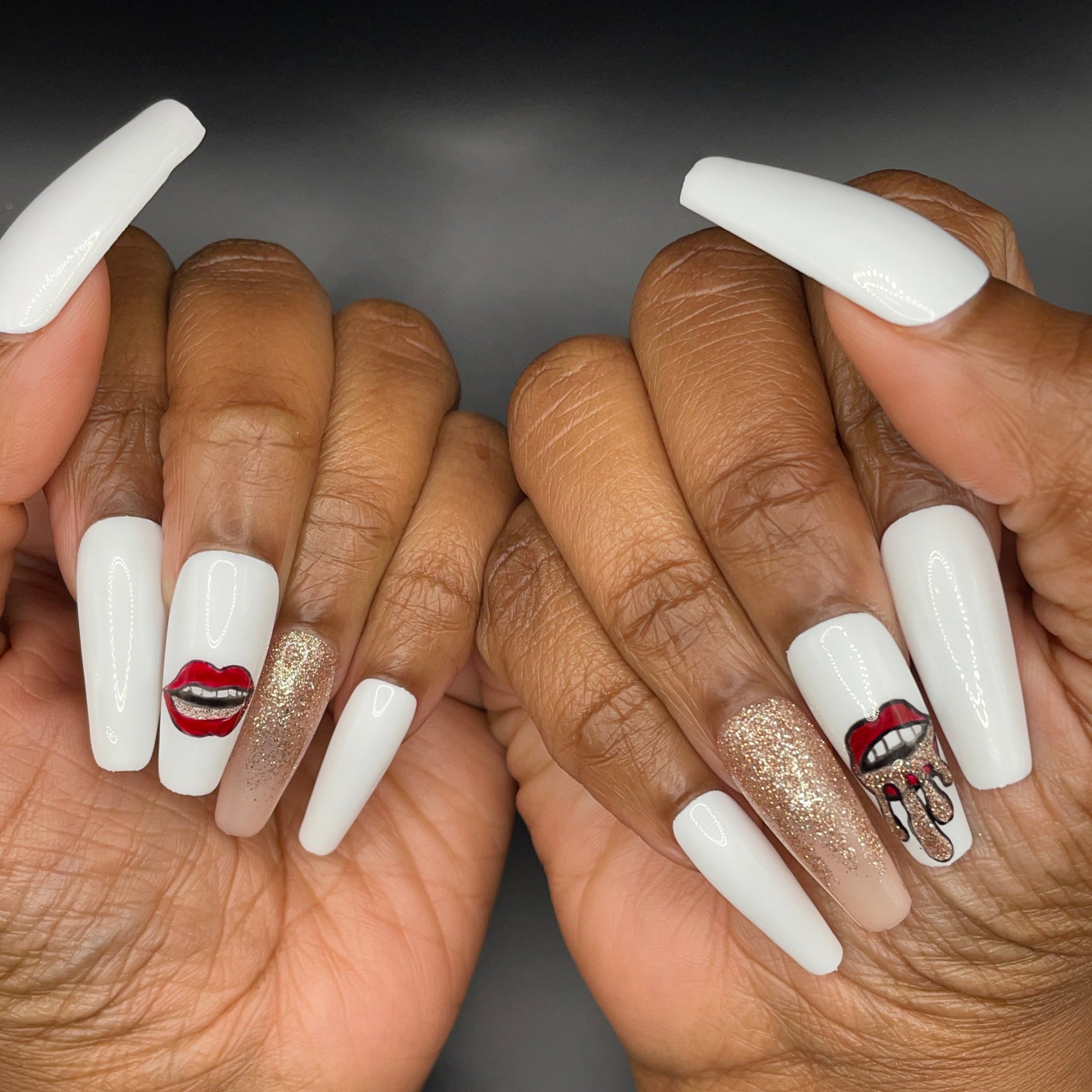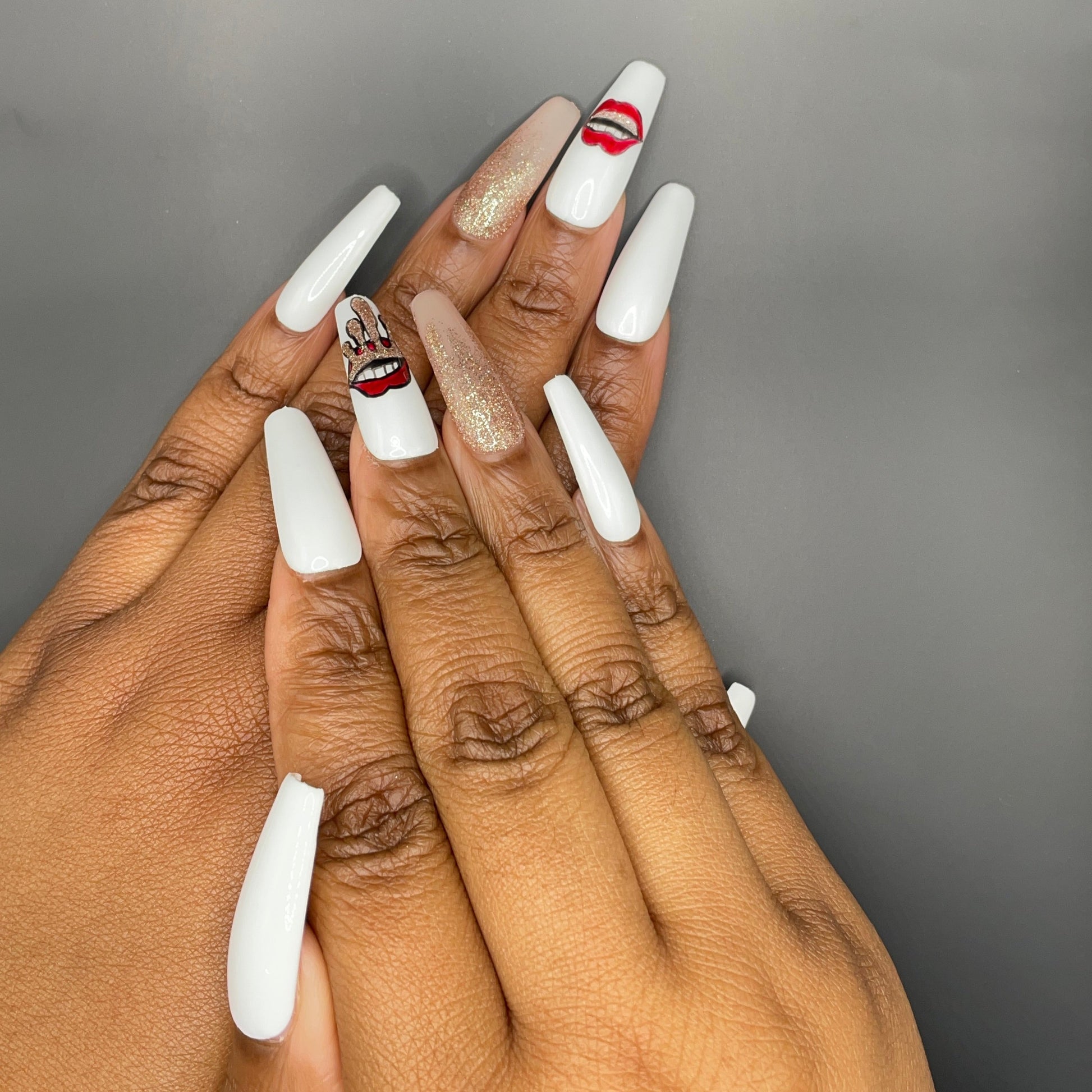 Get rockstar style with Rolling Baby press-on nails. Inspired by the Rolling Stones with a twist, these nails will have you ready to rock and roll. No more nail salon appointments, just press them on and get ready to show off your edgy style.